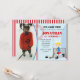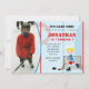 Convite de aniversário de Hóquei no Gelo com foto para rapazes, com fundo vermelho.