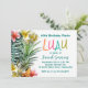 Convite de festa de luau havaiano tropical. Crie para uma festa de aniversário ou qualquer evento especial. Adicione o nome completo ou primeiro nome do convidado de honra (por exemplo, use letras maiúsculas com espaços entre para apenas o primeiro nome). Os cartões brancos têm uma grande borda de elementos tropicais, como flores de plumeria tropical, abacaxi e folhas da selva. O texto do modelo é verde-esmeralda escuro e o verso tem um padrão de abacaxis.