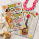 Super divertido Luau Birthdayparty havaiano Luau com uma garota vintage hula e flores hibiscus contra um fundo de madeira curtida. As costas apresentam um ukulele de madeira.