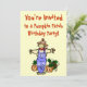 Um convite de aniversário de abóbora fofo com espantalho e abóboras. Personalize com seus próprios detalhes.