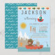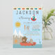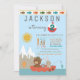 Convites de festa de aniversário de pesca com urso e coelho da floresta fofos pescando em um barco em um fundo de lago de montanha na frente e design de água no verso. Esses convites de festa de aniversário de pesca para qualquer idade são facilmente personalizados para o seu evento, basta adicionar seus detalhes. Você também pode alterar a cor do fundo desses adoráveis convites de festa de aniversário de pesca.