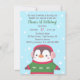 Um convite de aniversário adequado para os feriados de inverno! Ele apresenta um pequeno pinguim fofo vestido de forma quente e aconchegante com um suéter verde com estampa de peixes e corações e protetores de ouvido. Neve caindo ao fundo.