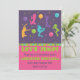 Convites de aniversário de trampolim coloridos e divertidos. As cores roxa, rosa, verde e azul. A design apresenta silhuetas de meninas pulando no ar ao redor de balões e confetti. Excelente de usar para uma festa de trampolim ou qualquer celebração que seja divertida o suficiente para as meninas saltarem para o ar. Pode ser usado para crianças e adolescentes.