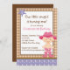 Comece a sua festa de aniversário de cowboys com o convite para o aniversário de criança da nossa linda menina, com um bebê cowgirl vestindo uma fralda, botas de cowboy e chapéu de cowboy montando em um fundo marrom de gingham com uma borda rosa. Bonito para uma festa de aniversário oeste pelo primeiro aniversário de um bebê. Visite o nosso compro para ver outros convites de festas de aniversário bonitos e notas de agradecimento, autocolantes e selos de correio. © Ilustrações JW