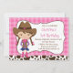 Comece a sua festa de aniversário com o convite para o aniversário de criança de uma menina linda com uma vaquinha vestindo azul e roxo com uma vaquinha com um fundo de listras cor-de-rosa com uma borda de corda e botas de vaqueira. Bonito para uma festa de aniversário oeste para o aniversário de um bebê. Visite o nosso compro para ver outros convites de festas de aniversário bonitos e notas de agradecimento, autocolantes e selos de correio. © Ilustrações JW
