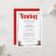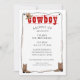 convites de festas de aniversários temáticos do excelente Cowboy para seu caubói favorito. Design tem a palavra Cowboy, chapéu de cowboy e botas de cowboy. Use nossa modelo fácil para personalizar com suas informações.
