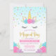 Convites de aniversário de unicórnio Whimsical para uma menina. Este design de diversão apresenta uma ilustração fofinha de um unicórnio, estrelas e flores. Tendy rosa, púrpura, lacre e um toque de falsa brilho de ouro.