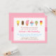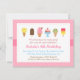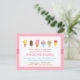 Tenha uma doce celebração para a aniversariante com uma festa de sorvete! Este convite colorido tem uma variedade de deliciosos sorvetes, bolas de sorvete em cones, sundae, sorvete de creme congelado macio, picolés, barra de sorvete com vários toppings! Fundo rosa claro com pontos dispostos em um padrão diagonal de quadrado. Design de convite elegante e sofisticado com uma paleta de cores pastéis e femininas, este é um convite delicioso que é ótimo para festas de todas as idades. Esperamos que seus convidados não o mordam. Este tema também é ótimo para uma festa de verão!