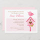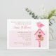 Um convite para primeiros aniversarios bonitos para meninas, com uma bela casa de pássaros e pássaros rosa.
