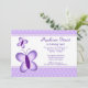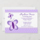 Duas adoráveis borboletas roxas aparecem neste lindo convite de aniversário de bolinhas roxo.