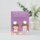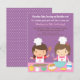 Planeje um cozinhar ou uma festa de aniversário de panificação e envolva seus convidados filhos no processo de fazer divertido da comida da festa, como cupcakes e cookies! Este convite tem dois chefs meninas bonitinhos. A garota com o clipe de cabelo vermelho segurando uma colher misturada enquanto a outra com banda de cabelo rosa segurando um uísque. Na mesa estão presentes muitos ingredientes para cozinhar, que incluem o recipiente de açúcar, a xícara, a tigela, o tabuleiro de bolachas, a embalagem de ovos, a taça de mistura, a manteiga e o leite. O que é cozinhar na festa? A paleta colorida de rosa e roxo é feminina e doce para uma aniversariante! Inverter página do padrão do bolinhas roxo. Personalize facilmente com os detalhes do seu partido!