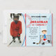 Convite de aniversário de Hóquei no Gelo com foto para rapazes, com fundo vermelho.