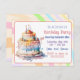 Convites de aniversário para meninas, crianças ou adultos. Bolo de aniversário caprichoso com glacê roxo, rosa, azul e amarelo e velas.
