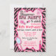 Adicione um pouco de corda à sua festa com este convite de aniversário de spa giro e adorável com sequências cor-de-rosa falso zebra stripe. Apresenta chinelos cor-de-rosa, espelhos, batom e esmalte. Ilustração desenhada à mão por McBooboo. Não sequências reais, é uma ilustração.