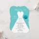 Este moderno, mas elegante convite para o almoço de noiva apresenta um vestido de noiva branca num lindo fundo aqua no qual todos os detalhes do almoço são impressos. Um buquê de noiva aparece à direita do vestido. O convite é um convite entre parênteses para adicionar um toque adicional de elegância ao seu evento especial. Direitos autorais