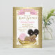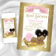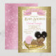 Convites de babyshower de bebê afro-americana com adorável bebê vestindo calças com babados cor-de-rosa e laços em uma bela almofada dourada e fundo com redemoinhos dourados e faixa bonita cor-de-rosa e dourada. Esses convites de babyshower cor-de-rosa e dourado são facilmente personalizados para o seu evento, basta adicionar os detalhes do evento.