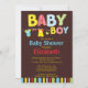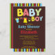 Comece o seu chá de fraldas de bebê com o nosso convite para chá de fraldas de roupa de bebê. Nosso convite para o bebê moderno apresenta uma lindinha de roupas para lavar roupas de bebê com um peitoril, bib & meias com grandes letras brilhantes e brilhantes colocadas sobre um fundo marrom com borda azul vermelha e verde listras e traseiras. ©Blackleaf Designs