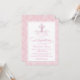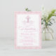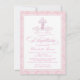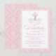 Convite de batismo de meninas com cruz de pérola rosa e escrita elegante em um lindo fundo de damasco rosa bebê. Este convite de batismo elegante é facilmente personalizado para o seu evento, basta adicionar seus detalhes no estilo de letra e cor, e na redação de sua escolha.