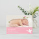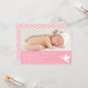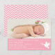 Um convite de Batismo ou Cristandade moderno, elegante e minimalista em cor-de-rosa doce em homenagem à menina. O design vem com um pombo voando carregando folhas no bico. Uma paleta de cores rosa doce para contrastar com o texto branco. Personalize com foto da pequena. No verso é um padrão zigue-zague em rosa e branco. Foto de amostra fornecida por TawnyNina.