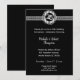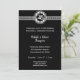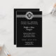 Convites de Bodas de Prata de 25 Anos Elegantes Preto e Prata. O convite tem um emblema prateado de 25 anos e o fundo preto faz com que as letras prateadas se destaquem. Adicione os detalhes da sua festa.