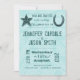 Um convite legal do casamento do país do estilo da tipografia com a estrela rústica no canto de superior esquerdo e uma ferradura à direita. O fundo é teste padrão azul bonito de paisley. Este é um grande convite para um casamento do estilo country, o casamento do tema do país, ou o casamento da vaqueira e do vaqueiro.