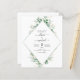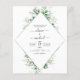 Convites de casamento de primavera com água-tinta geométrica verde e dourada e botânica de eucalipto em fundo branco - inclui tipografia de roteiro bonita e elegante com folhas botânicas modernas e folhagens para a celebração especial do dia do casamento.