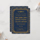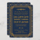 Estes convites para casamento apresentam uma paleta de cores azul e dourada, uma estrutura geométrica, padrões geométricos e outros detalhes estilísticos, todos inspirados na Arte Deco e nos vinte anos ruidosos. Você pode personalizar os campos de texto de exemplo de acordo com o seu gosto.