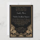 Um convite de casamento ousado, sofisticado e elegante com um tema vintage "Gatsby Excelente" dos anos 20 em tons de ouro preto e escarnecido. Um fundo preto a jato destaca a borda do estilo rico, geométrica do Art Deco, em tons de bege ouro. As fontes de estilo de período fundamental foram selecionadas para o seu texto de evento especial. Os nomes do noivo e do noivo são enfatizados usando um tom de cinza prateada contrastante. Selecione o tipo de papel desejado na ampla faixa disponível para concluir o efeito.