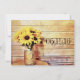 O Twine Molhou Mason jar com Wooden Heart com Buquê de Convites de Casamento de Girassóis. Estes convites de casamento de países rústicos apresentam um vidro de mason embrulhado com um buquê de girassol contra um design de fundo de madeira de barno em apuros rústicos. O jarro de mason também tem um coração de madeira na sua frente. O mesmo impressão de madeira de celeiro apressado rusticado também está na parte de trás do anúncio do casamento. Basta adicionar o convite de casamento aos campos de modelo. Use o botão "Personalizar" se precisar mover as coisas ou alterar o estilo da fonte ou a cor da fonte.