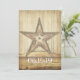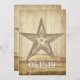 Convites de madeira ocidentais do casamento da estrela do país rústico com um fundo afligido da madeira do celeiro. A estrela de madeira do vintage antigo está descansando em uma mesa de madeira. Estes convites ocidentais do casamento do país original são grandes para casamentos do país, casamentos do celeiro, casamento do vaqueiro, e qualquer um que ama a decoração home do país de origem.