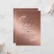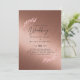 Este belo convite para casamento de aparência metálica rosa-ouro moderno, com campos modernos de tipografia e modelo de texto, em ambos os lados, garante que você possa adicionar todos os detalhes necessários, incluindo recepção, rsvp, registro de presentes, direção e muito mais. Para itens correspondentes e edições personalizadas, o designer de contato LeahG.