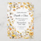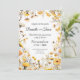 Este convite de casamento apresenta uma delicada e romântica estética floral. A design centra-se em flores silvestres amarelas e púrpuras macios com verde, criando uma vibração convidativa e inspirada na natureza. O fundo é sutilmente sombreado com uma lavagem leve e com aquarela, adicionando uma atmosfera macia e calmante ao cartão. A tipografia é elegante e formal, com os nomes dos casais em letra graciosa. No geral, o cartão evoca um sentido de charme rústico e elegância eterno, perfeito para casais que querem uma mistura de beleza natural e estilo clássico de casamento.