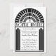 Um convite clássico e casamento vintage em negrito preto e branco. Um gráfico estilizado da Deco de Arte que incorpora uma cintura solar, uma armação e painéis altos decoram esta design impressionante e uma silhueta de noiva e seu noivo com uma sombra de cinza esmaecida completam a imagem. Art Deco era um estilo popular no 1920, nos anos 1930 e 1940. A cor de fundo deste convite pode ser alterada para qualquer cor que você escolher através das opções "personalizá-lo".