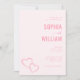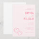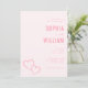 Este convite de casamento apresenta um design minimalista e elegante com um fundo rosa suave, criando uma atmosfera calorosa e convidativa. O layout é limpo e bem espaçado, destacando os nomes em letras serifadas em negrito e corações sutis em arte de linha que adicionam um toque de romance. Com espaços reservados personalizáveis para detalhes pessoais, oferece versatilidade, mantendo uma estética moderna e discreta, perfeita para casais que buscam simplicidade e clareza nos convites do seu dia especial.