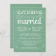 Coma, beba, e seja casado — convites de casamento rústicos de campo ao estilo Vintage — Rolamentos suaves, encaracolados e tipografia de moda antiga em um fundo de burlap up verde de menta. Adicione seus nomes e informações de casamento neste modelo fácil de usar. O elegante, mas divertido e caprichoso, escrevendo de script de estilo chalkboard pode ser modificado para o seu tema de casamento formal ou semiformal. O estilo moderno casual é perfeito para casamentos contemporâneos modernos, com um toque divertido de encanto sofisticado para a noiva e noivo tradicionais. Entre em contato conosco para obter ajuda com a personalização se precisar de espaço adicional para os detalhes do casamento. Outros tamanhos e estilos de quadro disponíveis.