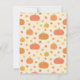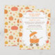 Um convite de chá de bebê para celebrar os pequenos que estão chegando no período de ação de graças, outono! Ele apresenta um carrinho de bebê que é projetado de forma única como uma abóbora! Um pequeno está sentado dentro comendo uma chupeta. Abóboras e folhas de outono decoram o fundo. Personalize facilmente com os detalhes do seu chá de bebê.