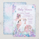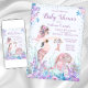 Convites de chá de bebê de sereia com adorável mãe sereia grávida segurando um lindo traje de bebê sereia em um belo fundo roxo e azul turquesa sob o mar. Este convite de chá de bebê de sereia é facilmente personalizado para o seu evento, bastando adicionar seus detalhes.