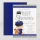Convite de chá de bebê da polícia com bebê adorável vestindo uniforme de polícia fofo e cachorrinho em um fundo azul e prata. Este convite de chá de bebê da polícia é facilmente personalizado para o seu evento, basta adicionar seus detalhes no estilo de fonte de sua escolha. Este é um design impresso sem folha de alumínio real, jóias, etc.