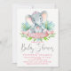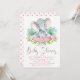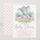 Convites de chá de bebê de elefante para meninas com adorável bebê elefante usando um laço rosa fofo em um fundo de folha de palmeira. Esses convites de chá de bebê de elefante são facilmente personalizados para o seu evento, basta adicionar os detalhes do evento.
