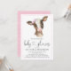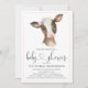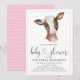 Convites de chá de bebê de vaca fofa com bezerro de vaca bebê em aquarela usando um laço rosa em um fundo de bolinhas rosa. Estes convites de chá de bebê de vaca adoráveis são facilmente personalizados para o seu evento, basta adicionar seus detalhes. Você também pode adicionar uma cor de fundo.