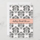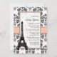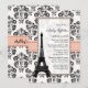 Convites de chá de noiva estilo parisiense bonitos e sofisticados com uma borda floral damasco preto e branco vintage antigo, design de fita impressa em coral pêssego e pálido e a Torre Eiffel nela. Projetado por Chrissy H. Studios, LLC. Todos os Direitos Reservados.