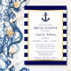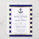 Cartões de chá de panela náuticos elegantes e atordoantes. Padrão de listras marinho azul e branca com moldura de folha de ouro e adorável âncora para adicionar aquele toque perfeito, mas elegante. Placas de modelo editáveis - Todo texto pode ser editado. A parte traseira do cartão também tem o Future Sra.... Pegue os adesivos correspondentes para seus favores!