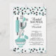 Chá de panela moderno da cozinha, com um pino rolante, misturando tigela, espátula, cortadora de pizza, uísque, descascador de vegetais e colheres-medida colocadas sobre um fundo branco contemporâneo com confete azul e bolinhas preto. Visite o nosso compro para ver este convite numa variedade de convites populares para chás de casamento.