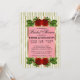 Rosas vermelhas profundas e suas folhas verdes enquadram a parte superior e inferior de um quadro dourado neste chá de panela. A área cor-de-rosa rosa contém os detalhes do chá. A fonte moderna atualiza o design. As faixas verdes em relevo criam um fundo interessante. Este cartão de chá de casamento acaba sendo um pouco vintage, um pouco moderno e um pouco chique. Você pode facilmente mudar todo o texto.