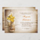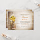 Chá de panela romântico com fundo de madeira rústico e jarro de pedras com flores amarelas e brancas. Chá de panela para amantes do campo para a noiva se apaixonar por mason jars. Eu sugiro um trabalho de Linen para esta design.