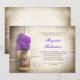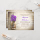 Fundo romântico de madeira rústica e jarro de pedras com convites de chá de panela de flores roxas. Eu sugiro um belo papel de textura de linho para este design.