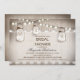 Burlap rústico elegante e chá de panela de renda branca com cordas de luz e jarras de pedreiro penduradas.