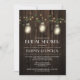 Convites de chá de panela de Luzes Russas do País - apresenta um fundo de madeira de celeiro com luzes cintilantes em volta da videira com frascos-pedras suspensos que também são iluminados ou cheios de vagalumes - design de vagalume.