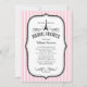 convites de chá de panela de Paris com um design cor-de-rosa, preto e branco, de estilo parisiense, apresentando a torre de Eiffel. Personalize o texto com as informações do chá de panela. Visualize exatamente como o convite acabado será exibido na tela antes de solicitar.