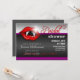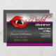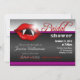 Convites de chá de panela temáticos do Halloween em cinzas vermelhas, roxas e escuras, com lábios e dentes de vampiro femininos lúcidos. O texto diz: "Junte-se a nós, à noite, enquanto {name} procura reivindicar sua "última vítima" (riscado para ler: "futuro marido").